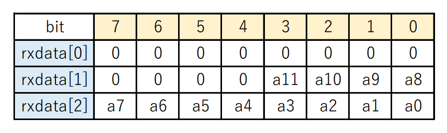 Pico側で読み取った値は図4のようになります。a0~a11 とありますが、A/D変換の結果である12bitのデータを意味しています。